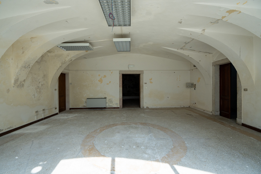 Il piano terra di 270 mq lordi si articola in tre avvolti sul lato ovest (H massima avvolti = 2,85-3,00 m), una grande corte voltata centrale (H massima = 3,25 m) con ampie porte-finestre verso est, in direzione del giardino che è proprio a livello del pavimento interno, oltre a un locale a sud-est adibito a Centrale Termica e, nell’angolo nord-est, un avvolto con finestra in parte occupato dal vano in c.a. che ospita l’ascensore. Al pianterreno, oltre al giardino di circa 1.026 mq circa, si trova anche un piazzale sterrato di circa 1.863 mq, ubicato sul lato nord al di là della stretta carreggiata di via della Libertà.